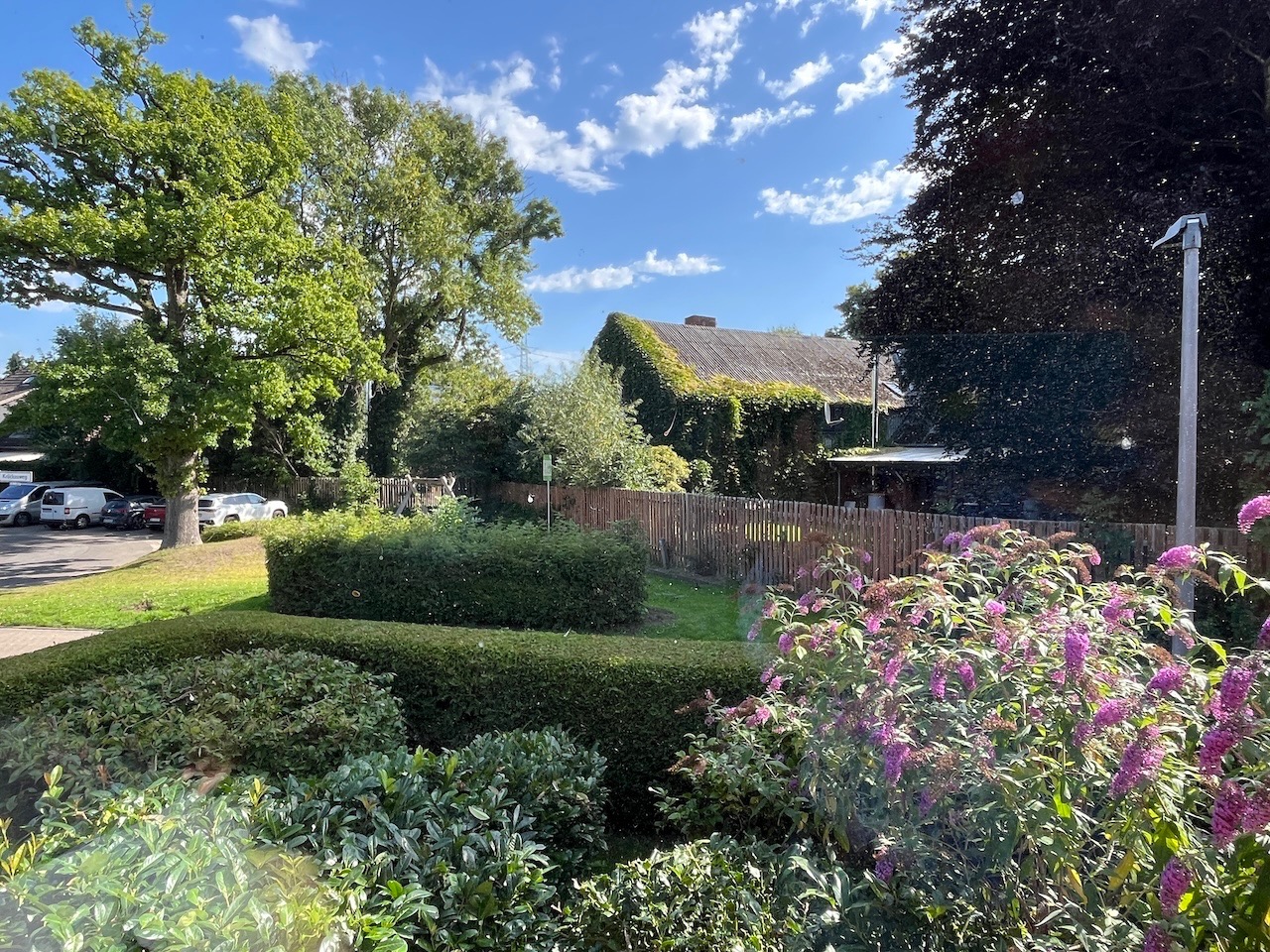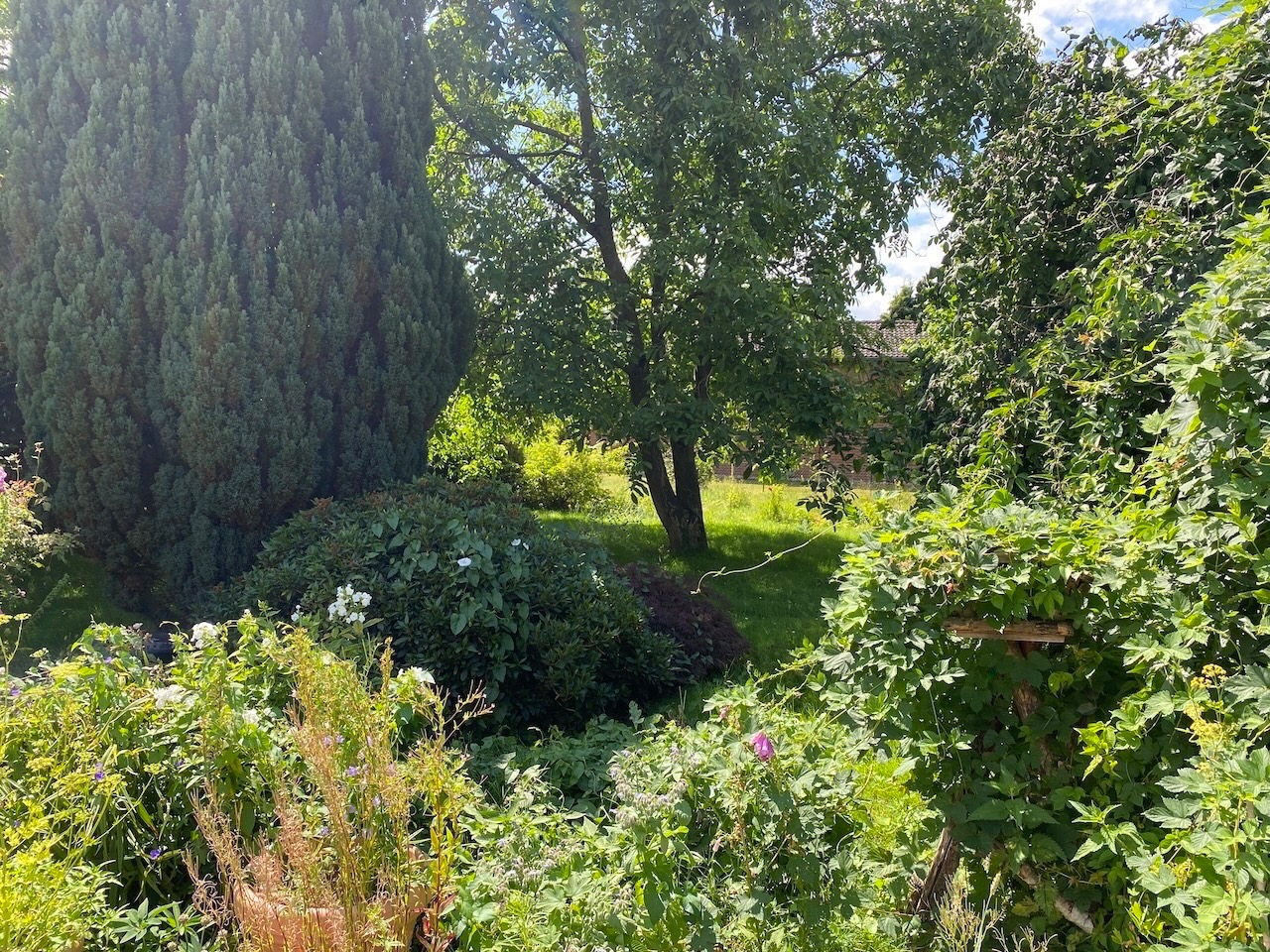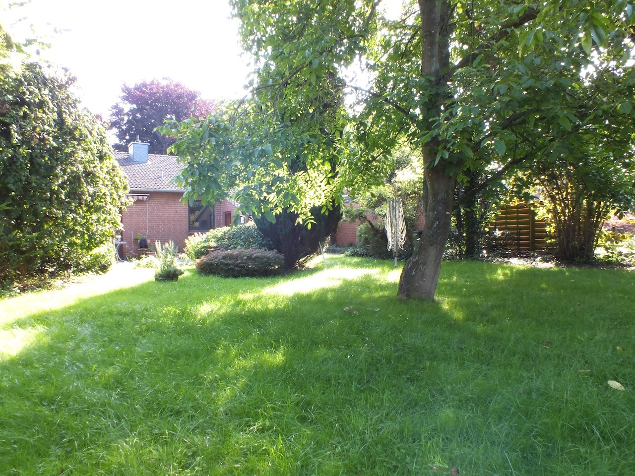 Der Garten begeistert mit altem Baumbestand, viel Platz zum Spielen und genügend Fläche für Hochbeete oder andere Gestaltungsideen – fast ein wenig angelegt wie ein Park.