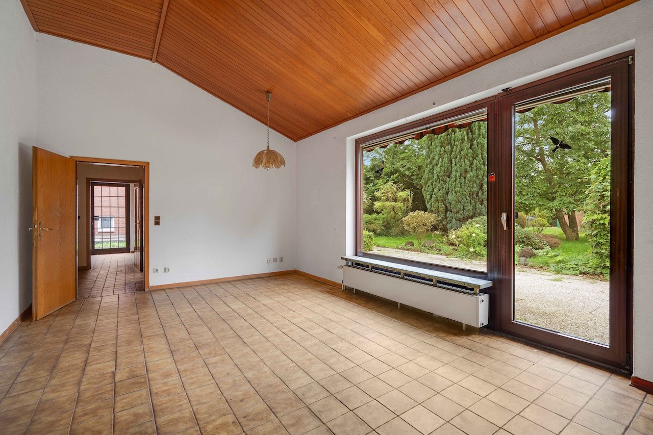 Das Haus selbst stammt aus dem Jahr 1978 und überzeugt durch eine interessante Architektur mit klarer Raumaufteilung. Auf drei Ebenen stehen Ihnen rund 130 m² Wohn-/Nutzfläche zur Verfügung. Im Obergeschoss befinden sich drei Schlafzimmer, während der bis zu 4m hohe Wohn- und Essbereich eine halbe Etage tiefer liegt. Besonders hervorzuheben ist das großzügige, lichtdurchflutete Wohnzimmer mit seiner großen Fensterfront und dem direkten Zugang zur nach Südwesten ausgerichteten Terrasse sowie dem weitläufigen Garten– perfekt für sonnige Nachmittage und gemütliche Abende.